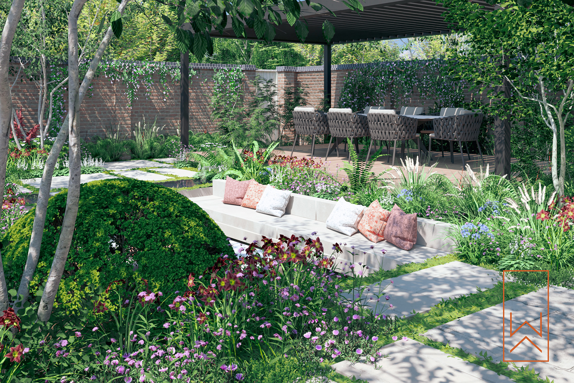 Set within the grounds of a period manor house near Leamington Spa, this courtyard garden was intended as a private and immersive retreat, backing onto a pool house. The clients sought a space for intimate gatherings, refined outdoor dining, and relaxed lounging—all wrapped in soft, seasonal planting.