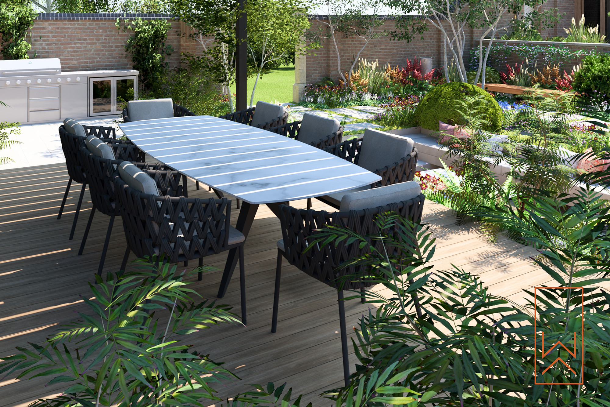 A covered pergola frames the dining area, integrating an outdoor kitchen and defining a space for longer stays and evening use. Planting was designed to contrast formal hedging with loose perennial and grass-based schemes, offering visual softness while preserving structure throughout the year.