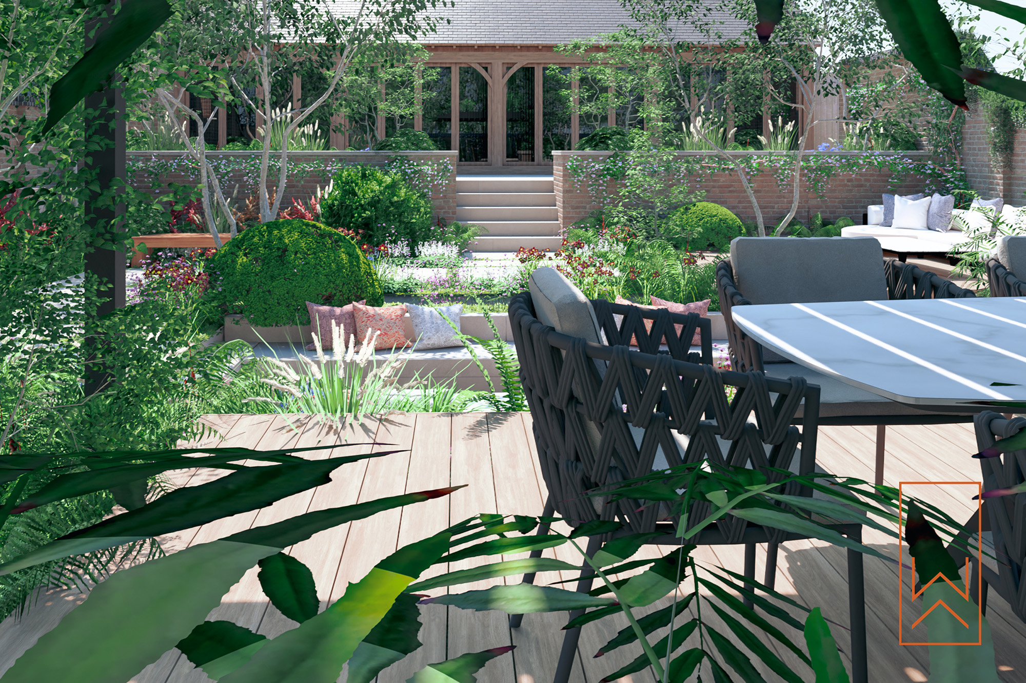 Taking cues from the surrounding architecture and brick-walled enclosure, the garden was organised into a layered series of terraces and transitions. A sunken seating area sits at the heart of the design, enclosed by abundant planting and facing a tranquil water feature. Subtle level changes and wide paved thresholds provide rhythm and journey through the space.